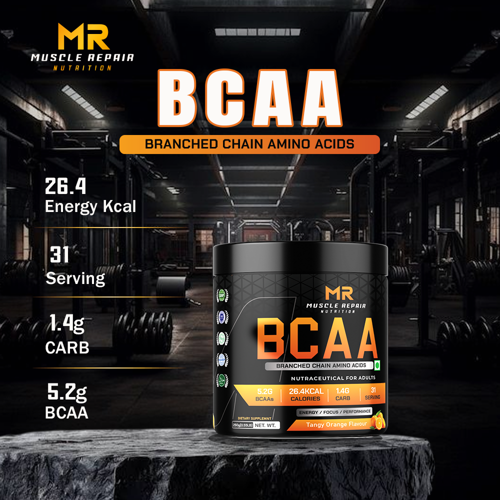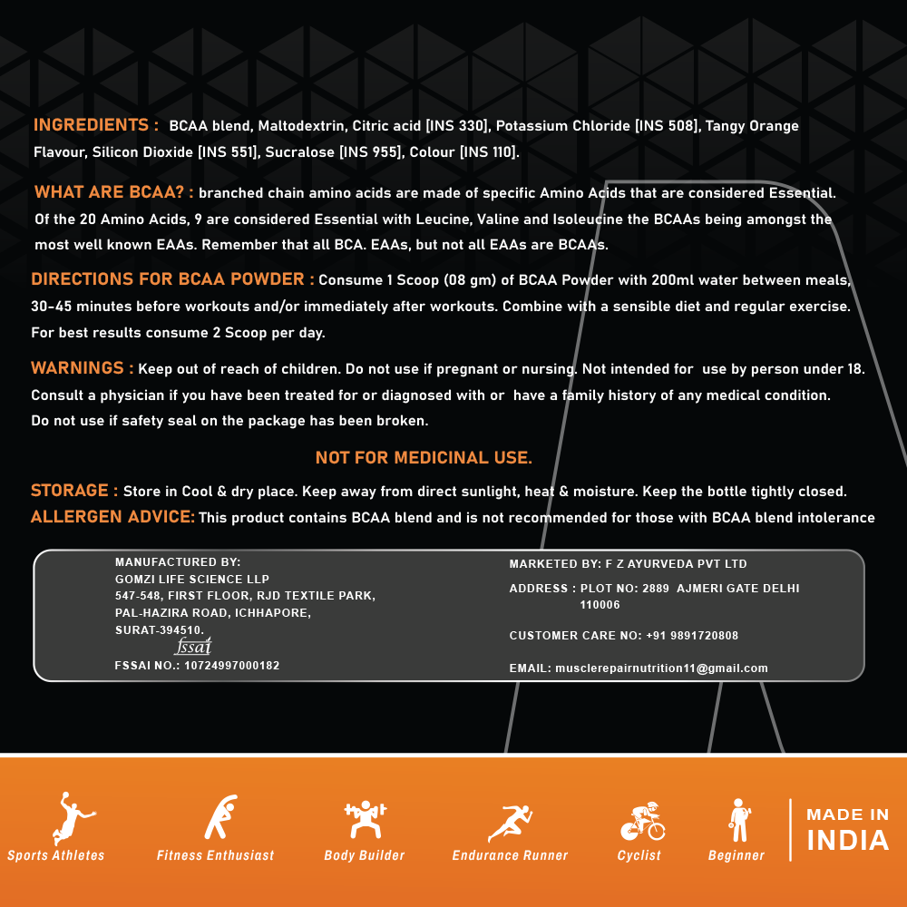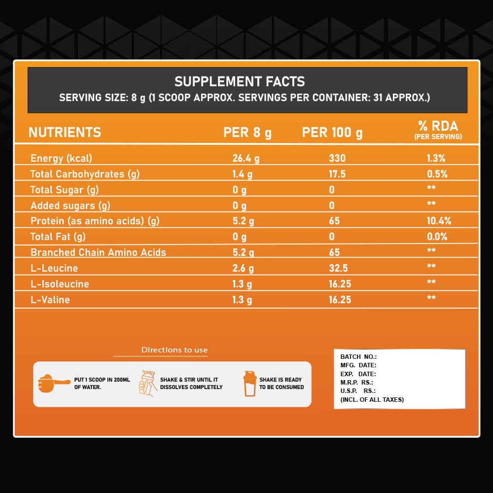 BCAA Blend (branched chain amino acid), Citric acid-INS 330, potassium Chloride INS 508, Silicon dioxide INS 551, Sucralose -INS 955, Orange Flavour, Sunset Yellow color -INS 122.