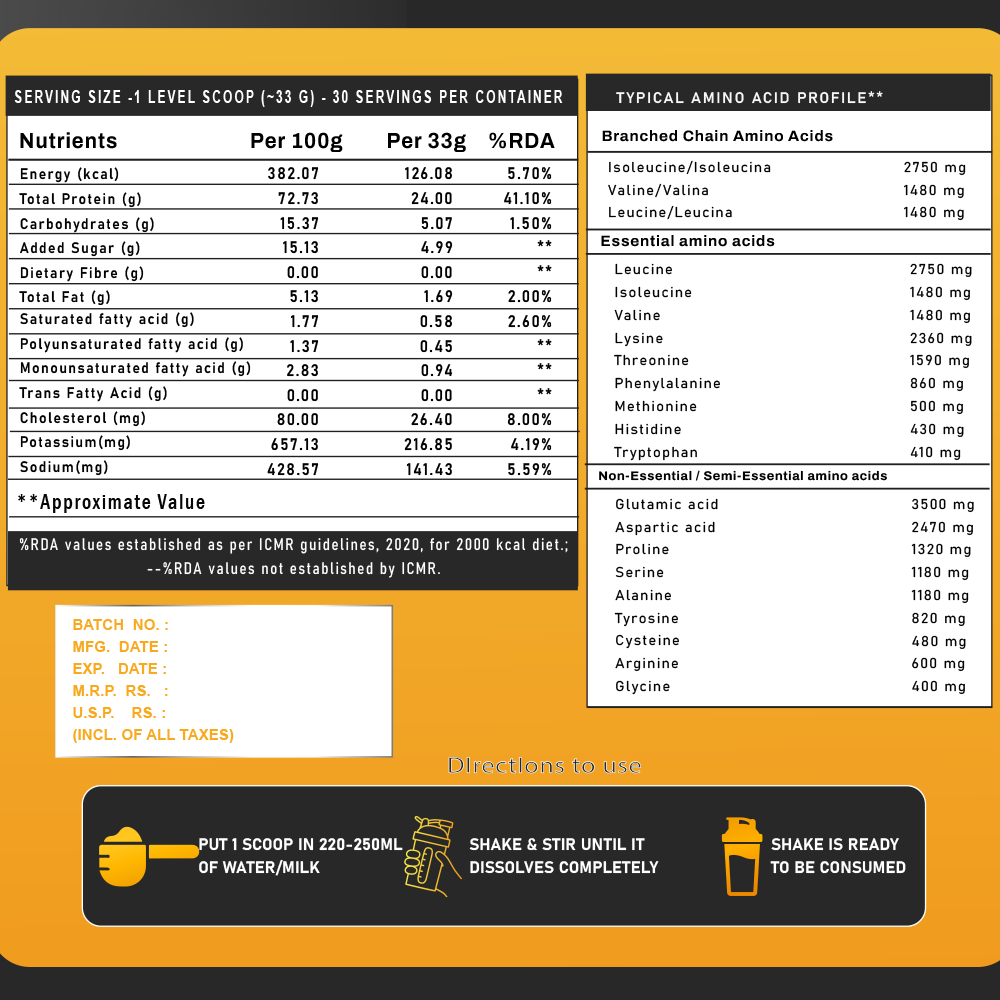 Add one rounded scoop (27 gm) of Whey Protein to 180 - 200 ml of your favorite liquid such as water, skim milk or almond milk. Stir with a spoon or shake in a shaker for 20-25 seconds until protein powder fully dissolves.
